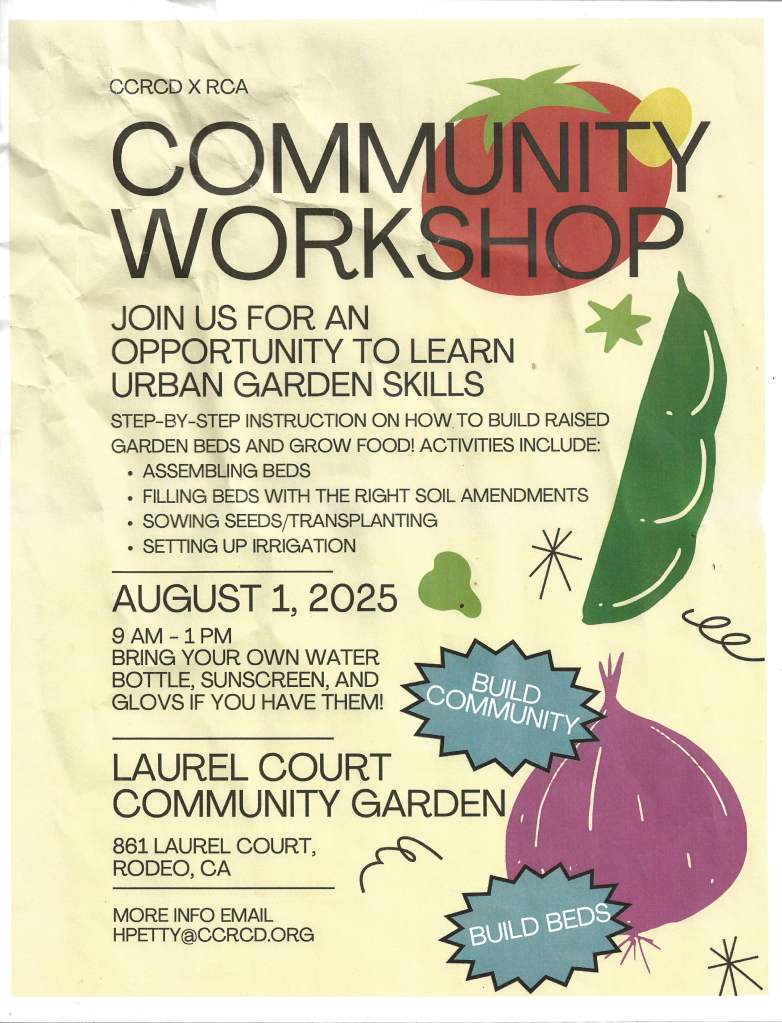 Please join the Contra Costa Resource Conservation District and the Rodeo Citizens Association in our first public workday at the new urban garden on Laurel Court. Join Assemblymember Wicks and staff for a day of gardening at this new community space in Rodeo. Be a part of the planning process and help us begin to create a space for fresh foods and pollinators! Let’s dig in together!